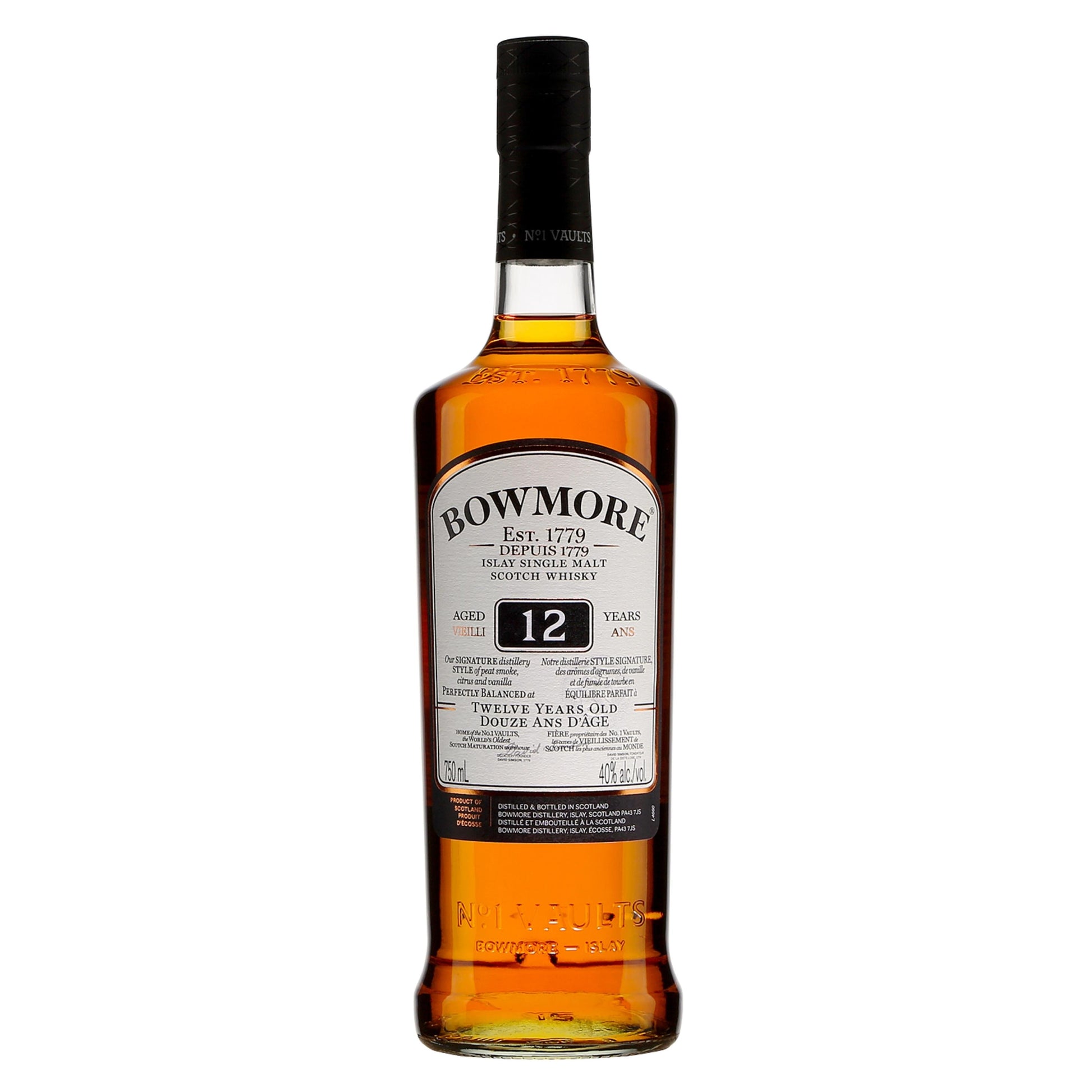 Reflecting the essence of Bowmore - thrashing waves, windswept landscapes and generations of tradition - our 12 years old is both complex and perfectly balanced. Subtle lemon and sweet heather honey complement Bowmore's trademark peat smoke, leading to a delicious, long and mellow finish.